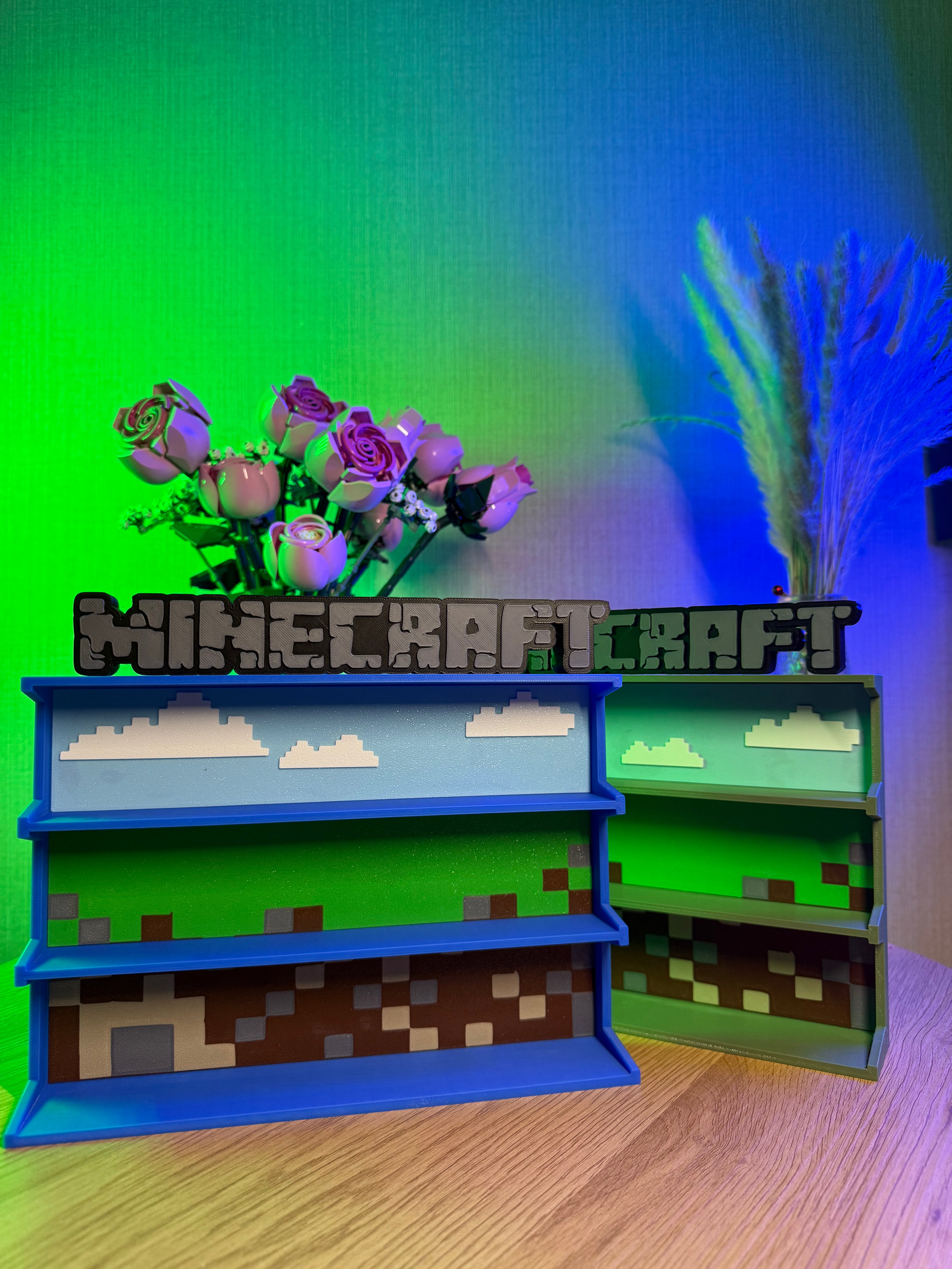 Ця тематична підставка у стилі Minecraft — ідеальний органайзер для зберігання міні-фігурок, колекційних предметів або ігрових дрібниць. Трирівнева конструкція з впізнаваним піксельним дизайном неба, трави та надр землі стане епічним доповненням інтер'єру справжнього фаната гри.ф