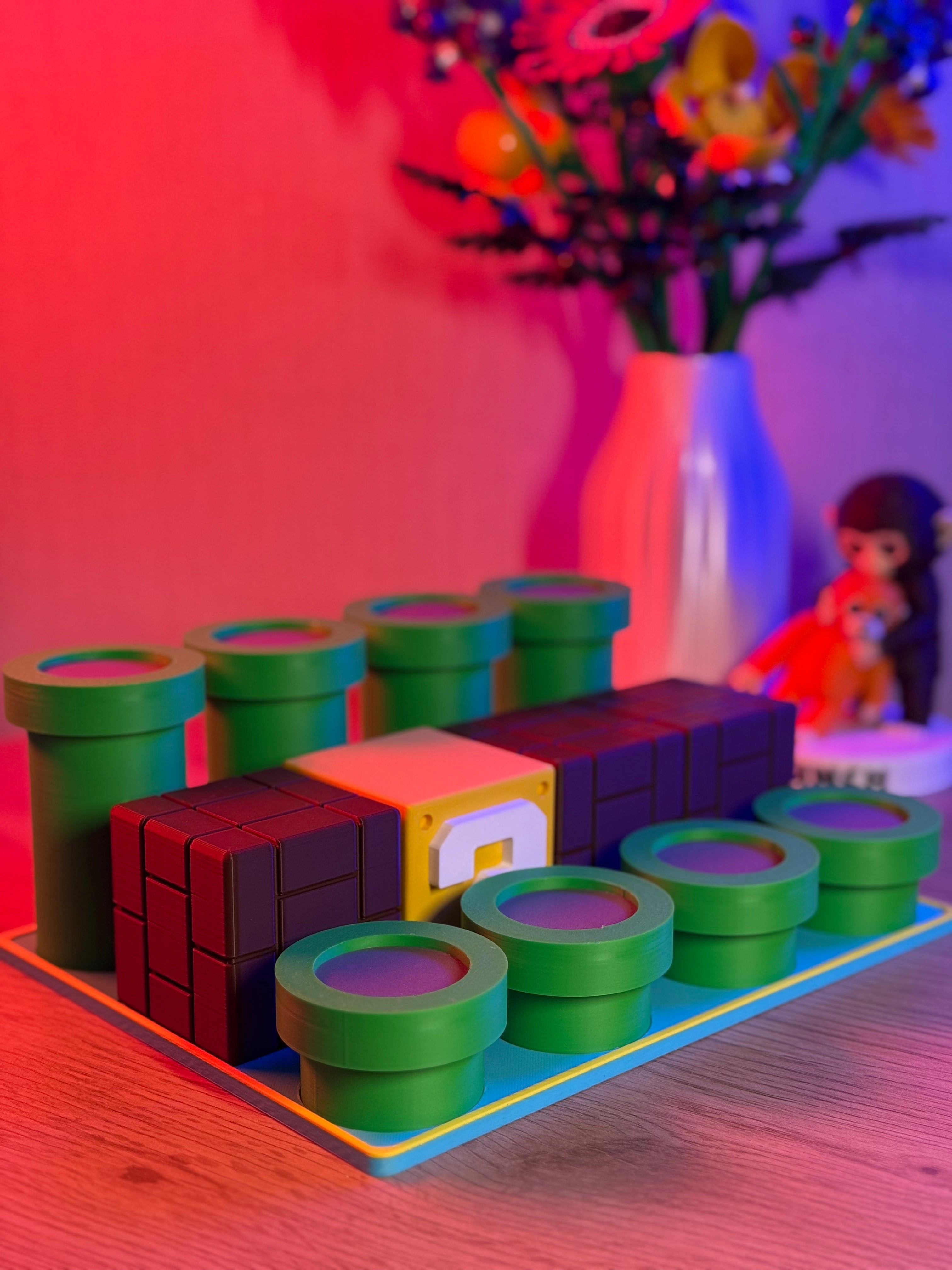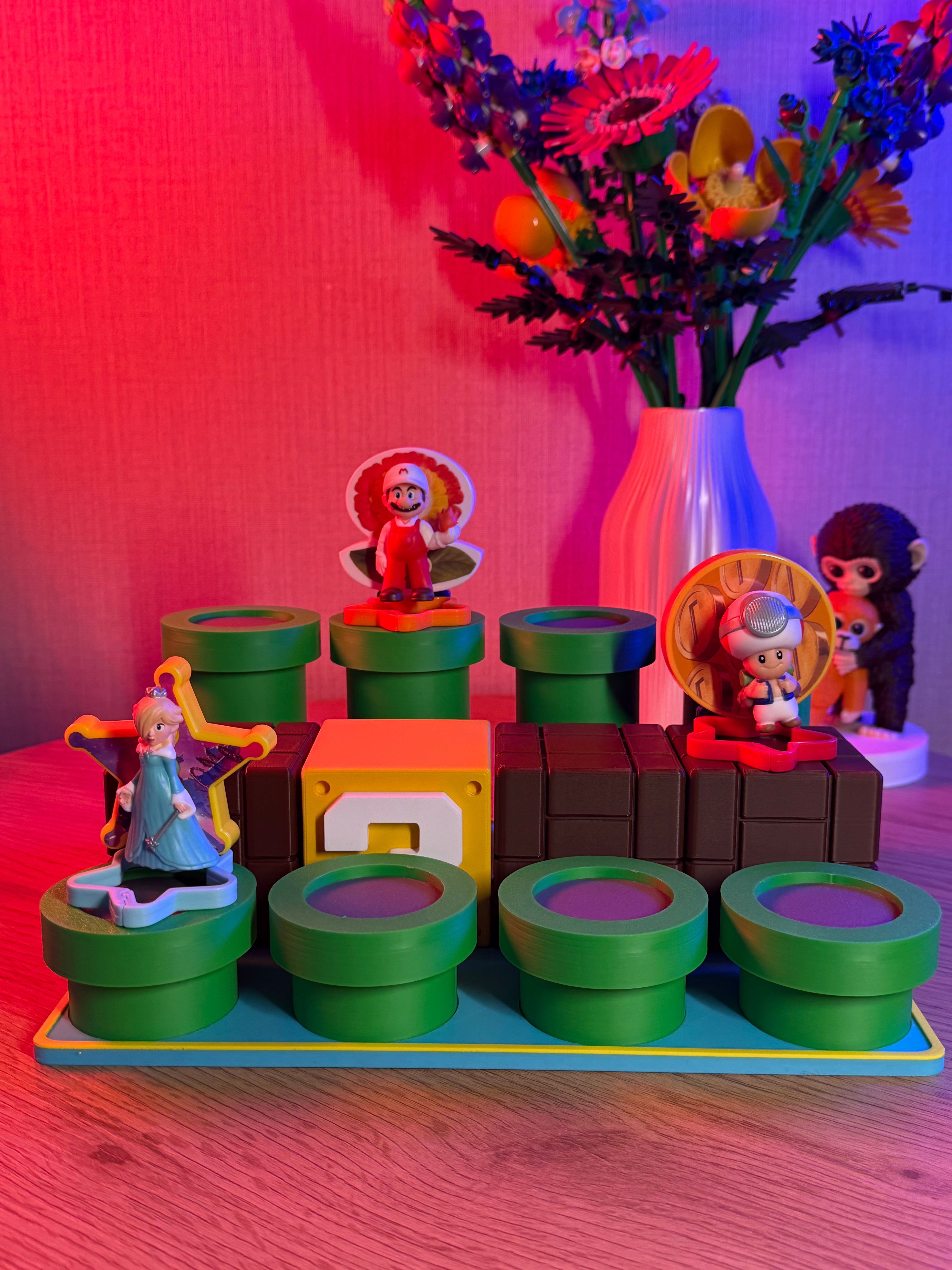 Поличка для фігурок Super Mario - це ідеальне рішення для фанатів легендарної гри, яке дозволяє не просто зберігати колекцію, а перетворити її на частину ігрового світу. Дизайн відтворює впізнавану атмосферу рівнів: від класичних зелених труб до блоків із питаннями, що робить композицію живою та динамічною.