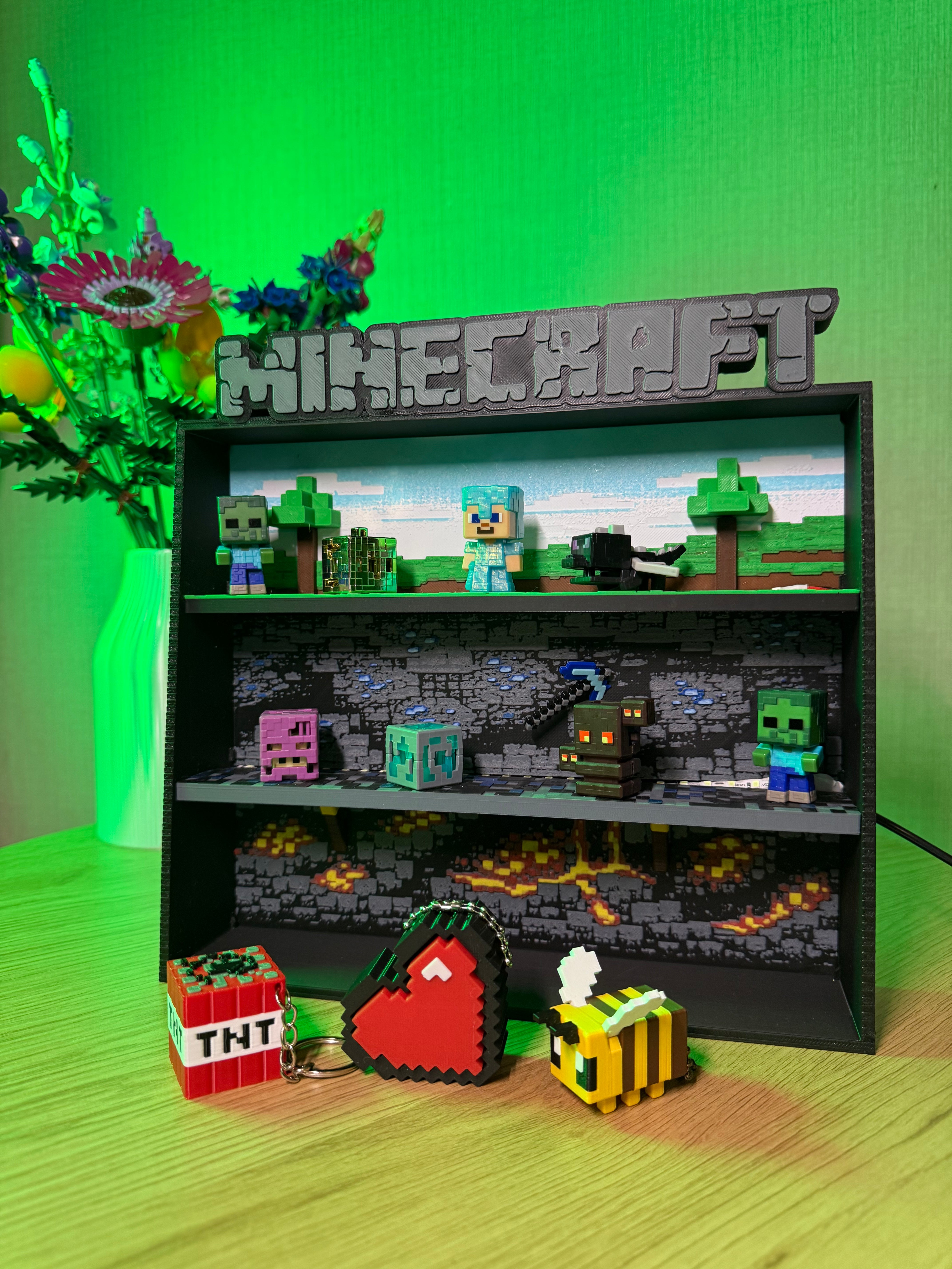 Стильна підставка для фігурок у стилі Minecraft, яка допоможе красиво організувати та показати вашу колекцію. Вона стане яскравим акцентом на полиці та додасть атмосферу улюбленої гри до інтер’єру. Чудовий варіант для зберігання фігурок і подарунок для фанатів Minecraft 🎮✨