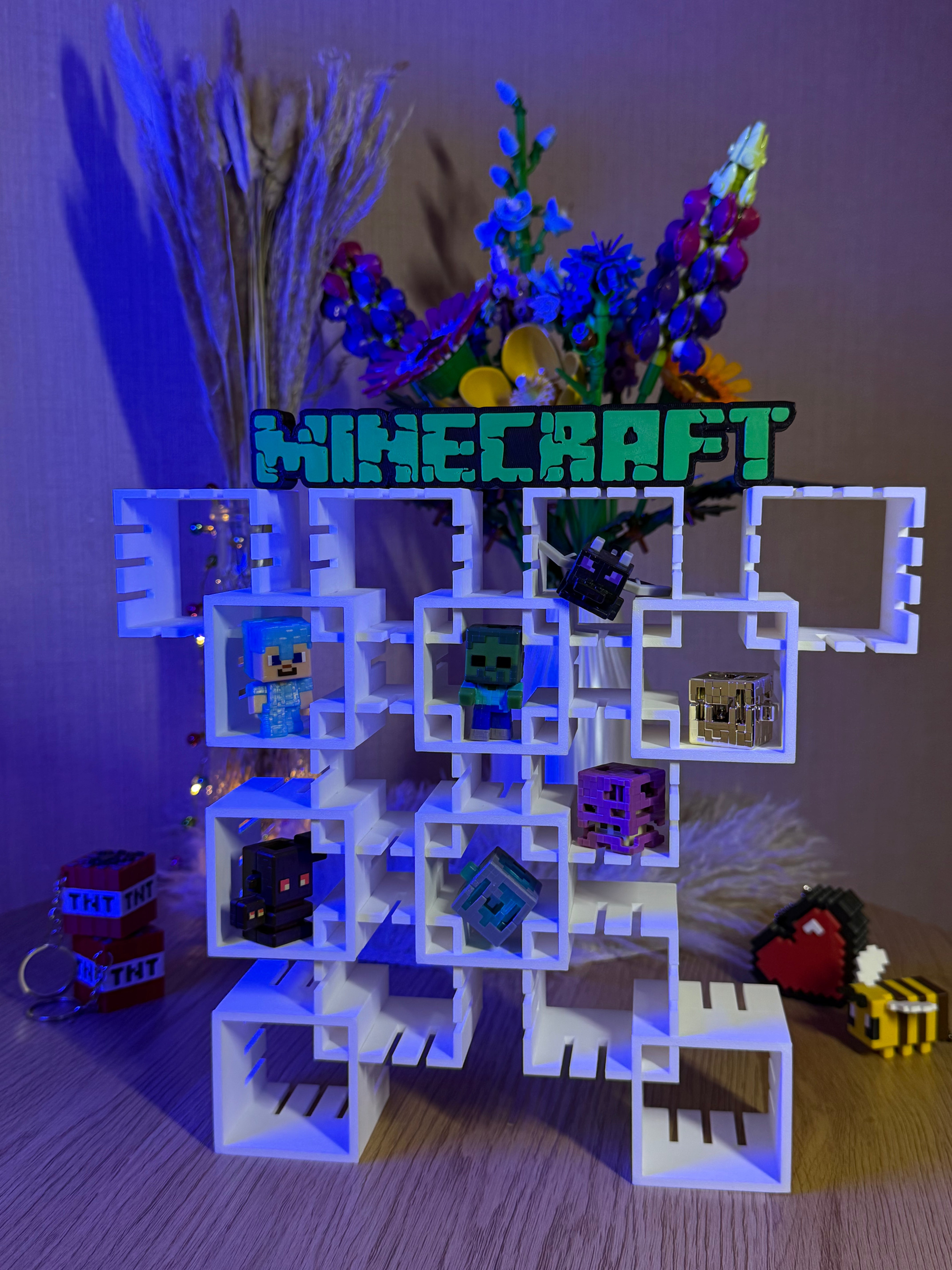 Цей стильний модульний органайзер у стилі Minecraft — справжня знахідка для колекціонерів. Білосніжна конструкція з геометричних кубів створює ефект «павутини» блоків, де кожна міні-фігурка отримує власну окрему локацію. Завдяки відкритому дизайну та фірмовому логотипу, підставка перетворює звичайне зберігання на ефектну частину ігрового всесвіту прямо у вас на столі.